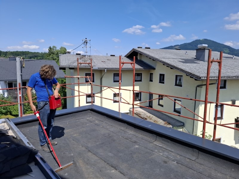 Der Vorteil dieser Methode besteht darin, dass sowohl Anschlüsse als auch große Flächen relativ mühelos untersucht werden können. Gerade im Neubau ist dies die perfekte Methode um ein Flachdach "abnehmen" zu lassen (laut LV-Ausschreibungstext von Architekten). Quasi als Dichtheitsprüfung mit Protokoll!